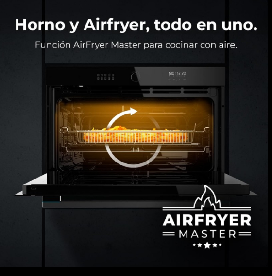 Airfryer Master: la opción más saludable empleando una mínima cantidad de aceite para conseguir el acabado que más te gusta, crujiente por fuera y tierno y jugoso en su interior, gracias al empleo de la convección forzada de aire caliente en toda la cavidad del horno.