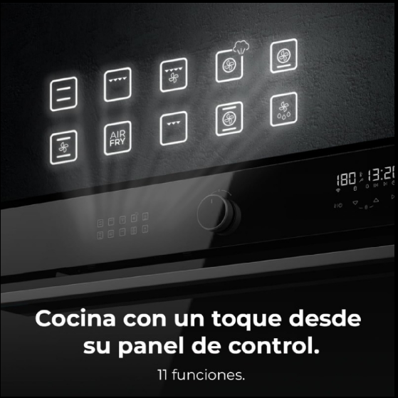 11 funciones: Convección, Maxi Grill, Fast cooking, Steam Asisst Cooking , Steam EasyClean, Fan Grill, Multicooking, Airfry Master, Pizza Master, 3D Cooking y Defrost. Elige con un toque en su display táctil ¡y listo! El horno programa el tiempo y la temperatura ideal de forma automática para que tú disfrutes de tu tiempo y de recetas perfectas.